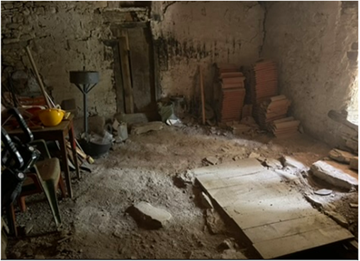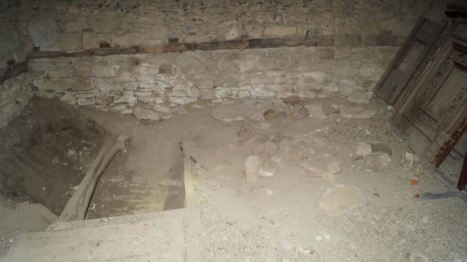 «Η είσοδός του στη γωνία του νάρθηκα ήταν ορατή, σκεπασμένη πρόχειρα για λόγους ασφάλειας. Από το άνοιγμά της εννέα σκαλιά οδηγούν στο εσωτερικό του ταφικού κτίσματος που αποτελείται από τρεις κλίνες περιμετρικά του θαλάμου, κατασκευασμένες από λίθους, κεραμίδες και κονίαμα».